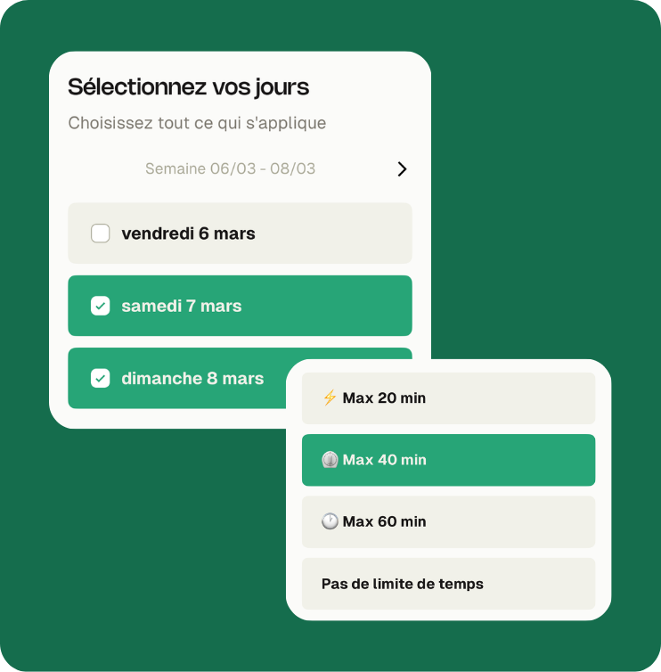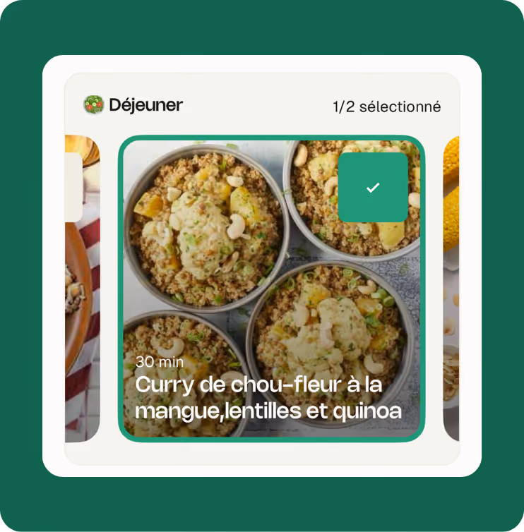 Choisissez les jours pour lesquels vous souhaitez planifier des repas. Nous tenons compte du temps de préparation, de vos préférences, de vos allergies et plus encore.